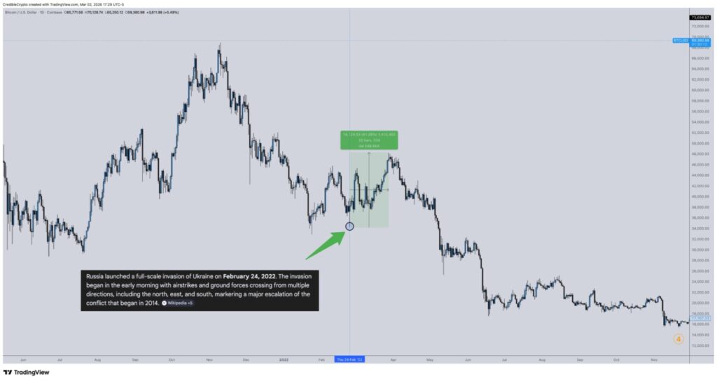Analisis juga membandingkan situasi saat ini dengan kondisi tahun 2022 ketika Rusia menginvasi Ukraina. Saat itu, banyak pihak menganggap invasi sebagai titik terendah lokal setelah koreksi panjang, dan harga Bitcoin (BTC) sempat naik 40% dalam sebulan.