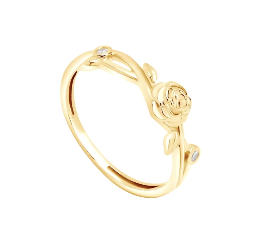 Lekukan batang dan kelopak mawar yang halus memperlihatkan keindahan craftsmanship pada perhiasan ini. Perpaduan desain bunga dan aksen batu kecil menjadikan cincin ini tampak lembut serta penuh karakter.