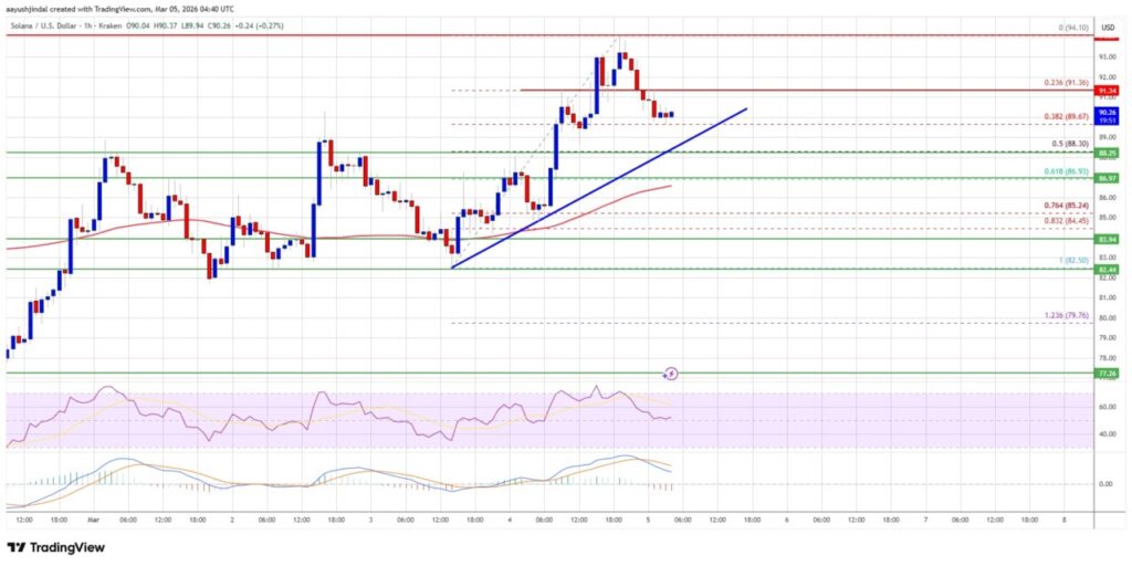 Secara teknikal, laporan menyebut SOL mulai menguat setelah bertahan di atas $85, lalu menembus $88 dan $90. Harga sempat membentuk puncak lokal di $94,10 sebelum terkoreksi ringan dan kemudian bergerak konsolidatif. Dalam konteks crypto dan cryptocurrency, fase konsolidasi seperti ini sering dibaca sebagai jeda sebelum arah tren berikutnya terkonfirmasi.