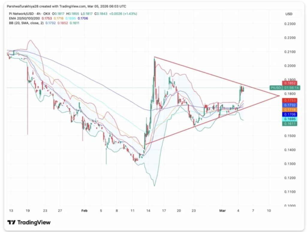 Jakarta, Pintu News – Pada 5 Maret 2026, Pi Network sempat diperdagangkan di sekitar $0.1843, naik 1.43% setelah berhasil menembus pola segitiga simetris yang selama berminggu-minggu menekan pergerakan harga.