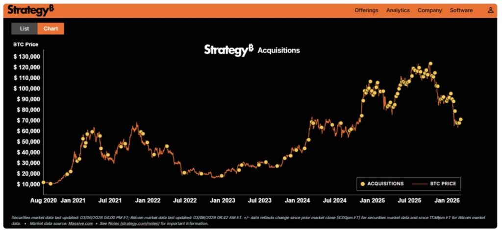 Sorotan kali ini tertuju pada Strategy, yang pada fase krusial mengonfirmasi pembelian 17.994 BTC dengan nilai sekitar $1,28 miliar dan harga rata-rata $70.946 per BTC. Transaksi tersebut meningkatkan total kepemilikan perusahaan menjadi 738.731 BTC, yang diklaim diperoleh dengan total biaya sekitar $56,04 miliar pada harga rata-rata $75.862 per BTC per 8 Maret 2026.