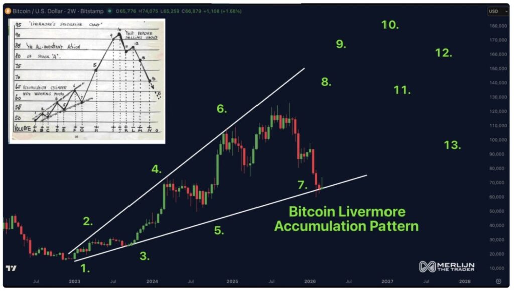 Menurut interpretasi yang beredar di komunitas trader, pasar tampak bergerak mengikuti urutan pola tersebut secara bertahap. Level kuncinya pun sederhana. Di atas $70.000, fase kenaikan berikutnya dinilai terkonfirmasi. Di bawah $60.000, pasar berpotensi hanya memperpanjang fase akumulasi.