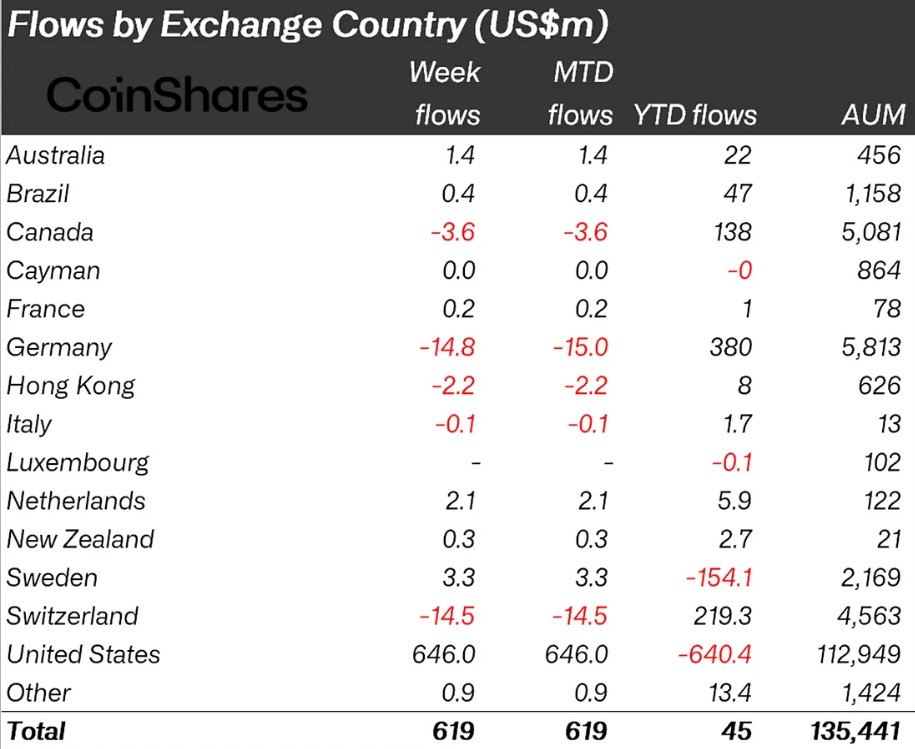 Laporan CoinShares menyoroti perbedaan mencolok antara wilayah Amerika Serikat dan kawasan lain dalam hal arus dana kripto. Amerika Serikat mencatatkan inflow terbesar dengan nilai $646 juta, menjadi penopang utama saldo positif mingguan. Sementara itu, Eropa justru mengalami outflow sebesar $23,8 juta, Asia kehilangan $2,2 juta, dan Kanada mencatat arus keluar sebesar $3,6 juta. Perbedaan ini menunjukkan bahwa sentimen investor di Amerika Serikat jauh lebih optimis dibandingkan dengan kawasan lain yang cenderung berhati-hati.