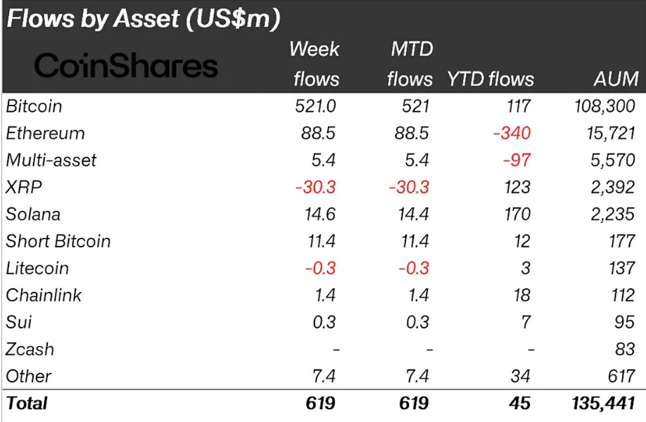 Bitcoin tetap menjadi primadona dengan total inflow sebesar $521 juta selama sepekan, menegaskan posisinya sebagai aset digital utama pilihan institusi. Namun, produk short-Bitcoin (BTC) juga mencatatkan inflow sebesar $11,4 juta, menandakan adanya perbedaan pandangan di kalangan pelaku pasar institusional. Ethereum menyusul sebagai penerima dana terbesar kedua dengan inflow $88,5 juta, sementara Solana (SOL) memperoleh $14,6 juta. Uniswap dan Chainlink masing-masing mencatatkan inflow sebesar $1,4 juta, memperlihatkan minat yang mulai tumbuh pada altcoin terpilih.