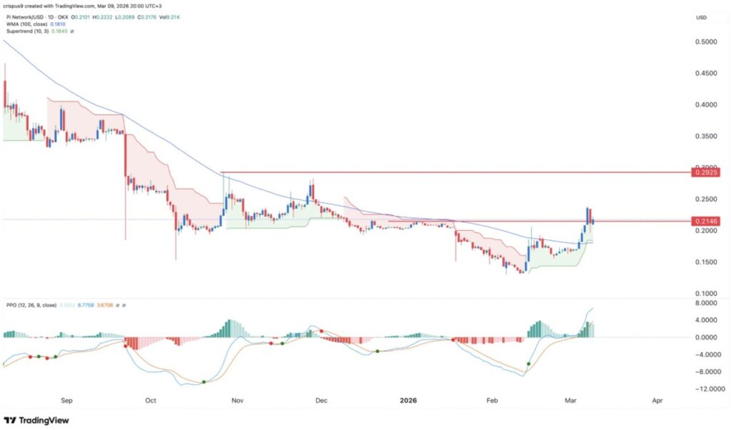 Analisis teknikal mengindikasikan bahwa harga Pi Coin masih memiliki ruang kenaikan dalam jangka dekat. Salah satu katalis utamanya adalah harga sudah bergerak menembus Exponential Moving Average (EMA) 100 hari. Selain itu, indikator Supertrend juga berbalik dari merah ke hijau untuk pertama kalinya dalam beberapa bulan terakhir.