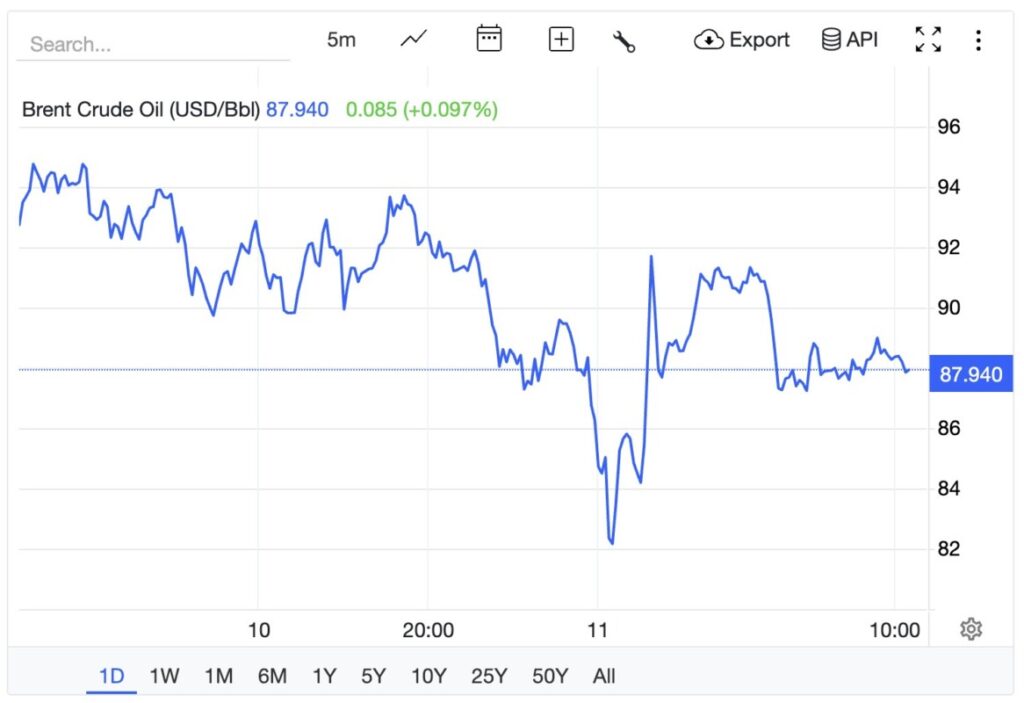 Grafik harga Brent Crude Oil menunjukkan fluktuasi yang signifikan pada hari ini, 11 Maret 2026, dengan harga terakhir berada di $87,940. Setelah mengalami kenaikan harga yang tajam, pergerakan harga terlihat stabil dengan sedikit koreksi menuju akhir sesi, yang mencerminkan adanya ketegangan di pasar energi global dan respons terhadap faktor ekonomi dan geopolitik.