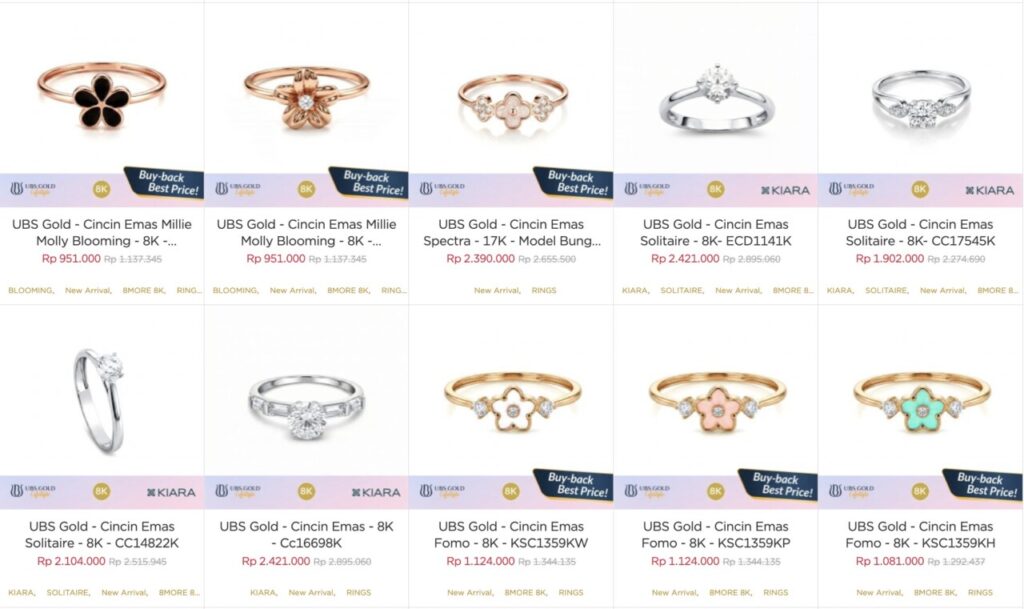 Harga-harga ini menunjukkan berbagai pilihan cincin emas UBS Gold dengan kualitas dan desain yang berbeda, menawarkan variasi harga yang dapat disesuaikan dengan preferensi dan anggaran pembeli.