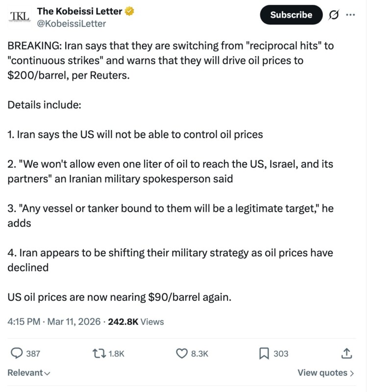 Pihak militer Iran menyatakan akan mengubah taktik mereka menjadi serangan berkelanjutan dan berusaha menghukum Amerika Serikat serta sekutunya dengan menahan pengiriman minyak. Selat Hormuz, rute utama bagi sekitar 20% pasokan minyak global, terus menjadi fokus konflik, yang mengakibatkan gangguan signifikan terhadap arus minyak dunia. Ancamannya dapat memicu kenaikan harga minyak hingga mendekati US$200 (sekitar Rp3,38 juta) per barel jika pasokan terganggu lebih lama.