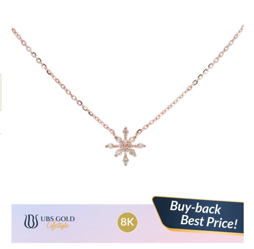 Kalung emas dari UBS Gold Lifestyle ini menampilkan desain yang elegan dengan sentuhan feminin yang modern. Mengusung warna rose gold, kalung ini memiliki kadar emas 8K dengan berat sekitar 1.75 gr, sehingga terasa ringan dan nyaman digunakan sepanjang hari. Perhiasan ini dibanderol dengan harga sekitar Rp2.477.000, menjadikannya pilihan aksesori yang elegan.