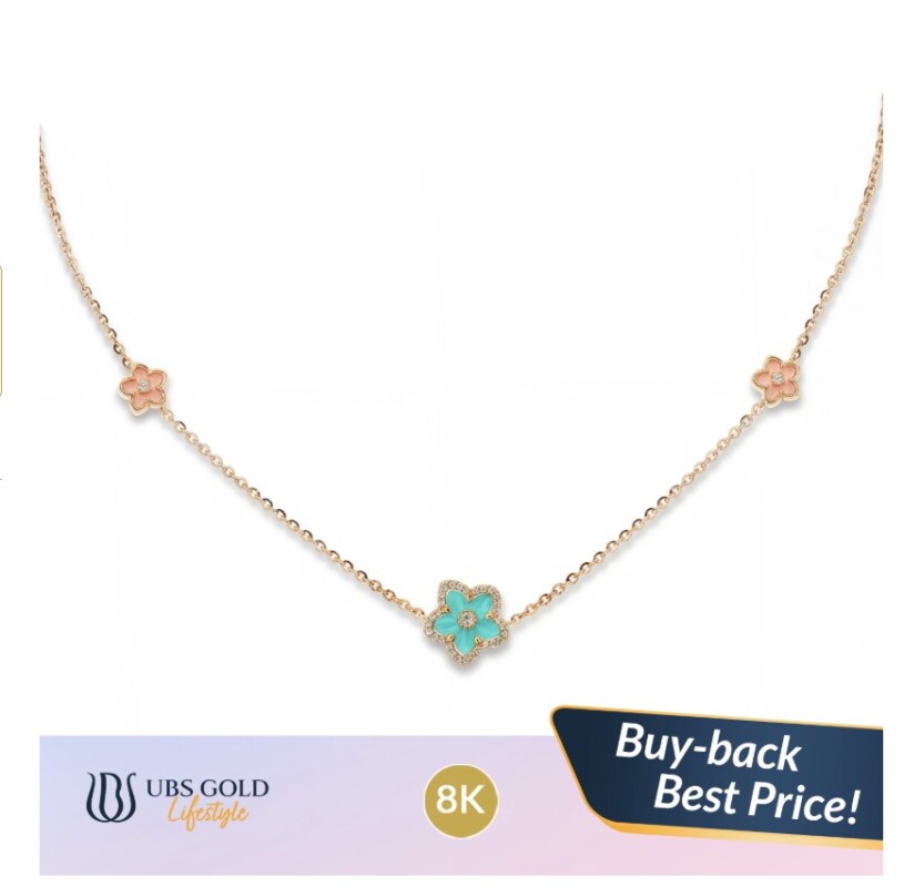 Kalung emas Fomo dari UBS Gold Lifestyle ini menampilkan desain yang ceria dan elegan dengan sentuhan motif bunga yang menarik. Menggunakan warna yellow gold, kalung ini memiliki kadar emas 8K dengan berat sekitar 3.54 gr, dan dibanderol dengan harga sekitar Rp5.010.000.