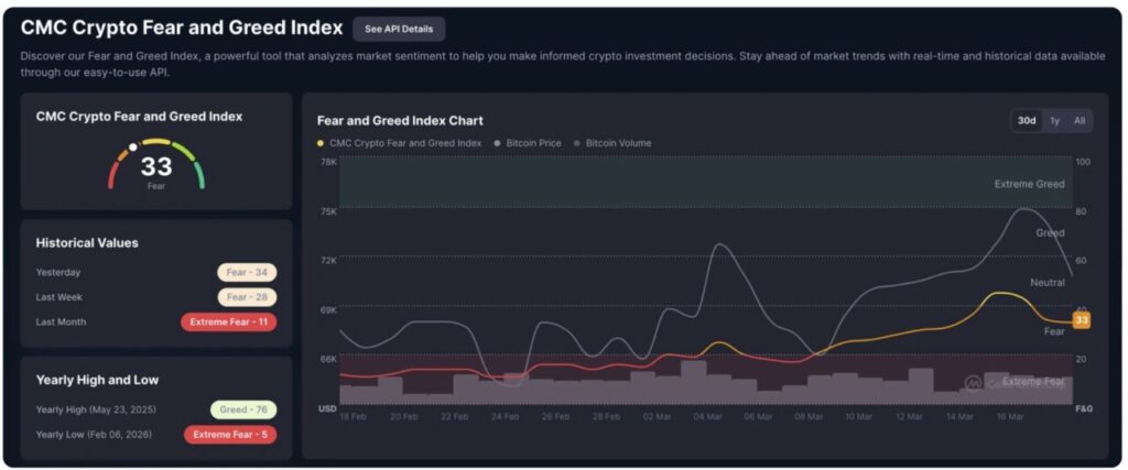 Keputusan The Fed untuk mempertahankan suku bunga tetap pada Rabu (18/3) turut menekan pasar kripto, membuat Bitcoin turun ke bawah $72.000 dan mendorong CMC Crypto Fear and Greed Index ke level 33, yang mencerminkan kondisi fear di kalangan investor aset kripto.