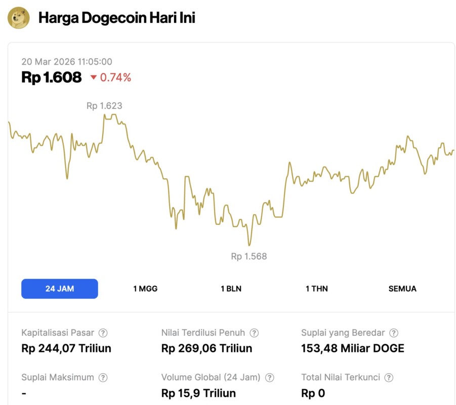Pada 20 Maret 2026, harga Dogecoin tercatat mengalami koreksi 0,74% dalam waktu 24 jam, diperdagangkan pada harga $0.09417 atau setara dengan Rp1.608. Dalam periode 24 jam terakhir, harga DOGE bergerak dalam kisaran Rp1.623 hingga ke Rp1.568.