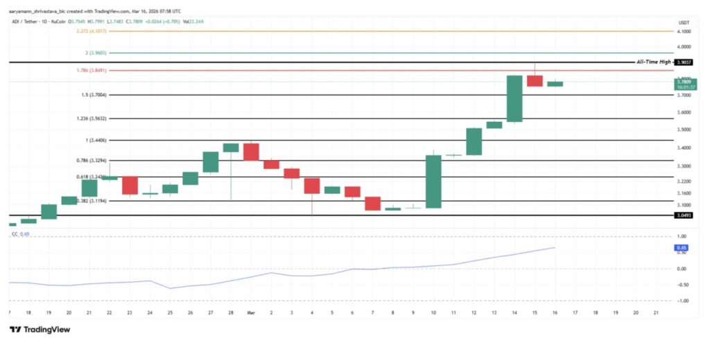 Pada 17 Maret, ADI sempat diperdagangkan kurang dari 4% di bawah rekor harga tertingginya sepanjang masa, yaitu $3.903, yang tercatat pada Minggu lalu. Dalam kondisi pasar saat ini, hanya sedikit token yang berada sedekat ini dengan level tertinggi historisnya.