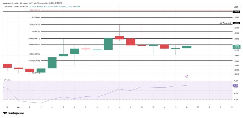 Level $0.442 juga bertepatan dengan garis Fibonacci retracement 61,8%, sehingga menjadi area teknikal yang sangat penting untuk diperhatikan. Indikator Money Flow Index (MFI) menunjukkan tekanan beli di kalangan holder CYS mulai meningkat, yang dapat menjadi dorongan bagi potensi breakout.