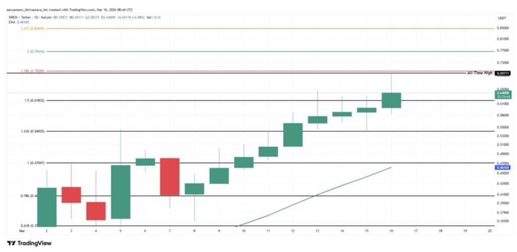SIREN juga menjadi salah satu altcoin yang bergerak mendekati rekor harga tertingginya. Token ini bahkan sempat mencetak ATH baru dalam perdagangan intraday hari ini dengan menyentuh $0.697. Altcoin tersebut terus melanjutkan momentum kenaikannya dalam beberapa waktu terakhir melalui penguatan harga yang konsisten.