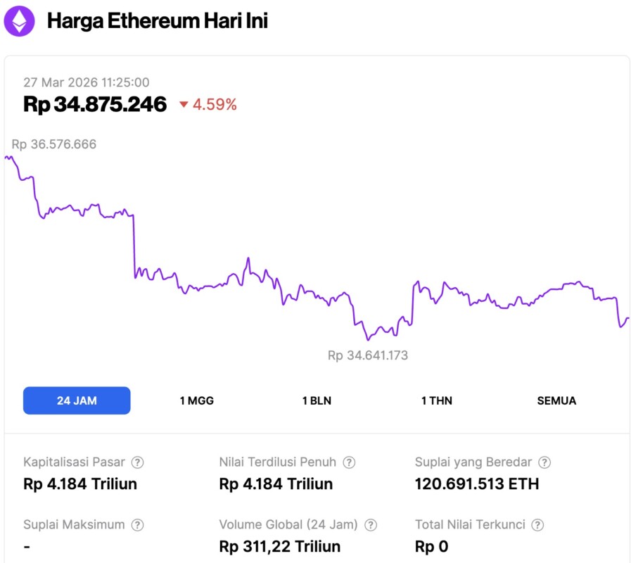 Pada 27 Maret 2026,Ā harga EthereumĀ tercatat berada di sekitar $2,050 atau setara dengan Rp34.875.246, mengalami penurunan 4,59% dalam 24 jam terakhir. Sepanjang periode ini, ETH sempat menyentuh level terendahnya di Rp34.641.173 dan level tertingginya di Rp36.576.666.
