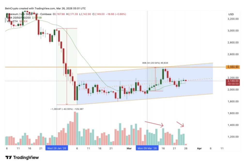 Sejak 6 Februari, ETH bergerak di dalam pola ascending parallel channel pada grafik harian, yang terbentuk setelah harga terkoreksi 43% dari swing high 28 Januari. Meski demikian, pola channel ini belum tentu menjadi sinyal bullish.