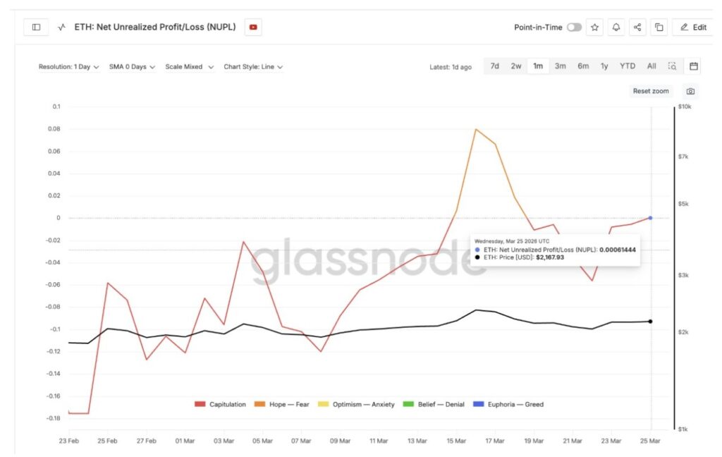 Kini, pembacaan NUPL memperlihatkan situasi yang berbeda. Per 25 Maret, NUPL tercatat di 0.00061, atau hanya sedikit berada di area positif. Meski terlihat kecil, angka ini menandai perubahan yang cukup berarti dibandingkan level -0.11 sebelum reli sebelumnya terjadi. Bahkan pada 22 Maret, sebelum reclaim terbaru dimulai, NUPL sudah berada di -0.05, yang berarti kondisinya sudah jauh lebih tinggi dibanding titik kapitulasinya di awal bulan.