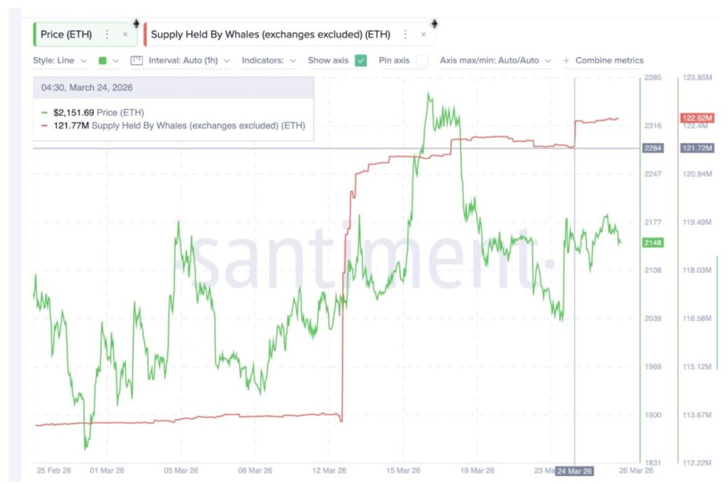 Meski begitu, ada satu kelompok yang belum menunjukkan minat jual, yaitu para whale Ethereum, yang didefinisikan sebagai wallet besar non-exchange. Berdasarkan data Santiment, kepemilikan kolektif mereka meningkat dari 121.72 juta ETH menjadi 122.62 juta ETH dalam periode 24 hingga 26 Maret. Kenaikan sekitar 900,000 ETH, dengan estimasi nilai sekitar $1.94 miliar pada harga saat ini, mencerminkan keyakinan dari holder berkapital besar.