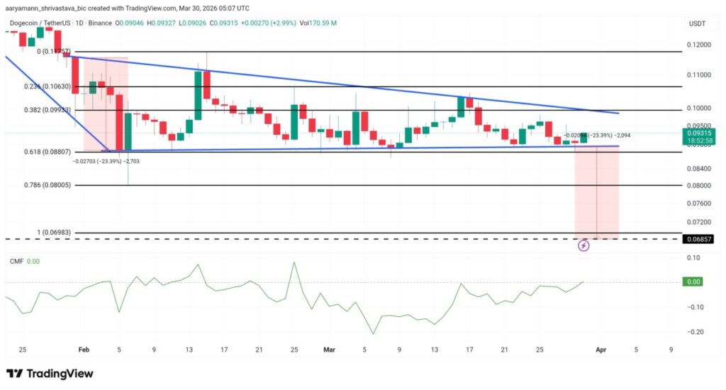 Dogecoin saat ini diperdagangkan di kisaran $0.09315 atau sekitar Rp1.584, dengan kenaikan harian tipis namun masih bergerak dalam pola descending channel sejak Januari. Indikator aliran dana menunjukkan kondisi netral, menandakan belum ada dominasi kuat dari pembeli maupun penjual. Situasi ini membuat DOGE berada di fase konsolidasi yang cukup krusial.