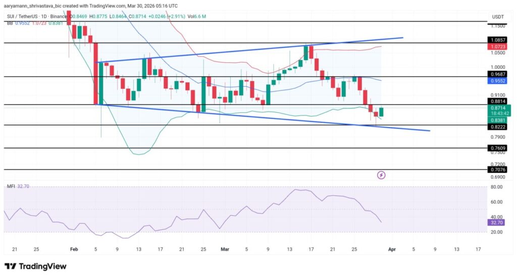 Sui diperdagangkan di level $0.8714 atau sekitar Rp14.819, dengan pergerakan harga berada dalam pola broadening wedge. Indikator teknikal menunjukkan kondisi mendekati oversold, yang secara historis sering menjadi titik potensi rebound. Namun, tekanan jual masih cukup kuat menjelang event besar yang akan datang.