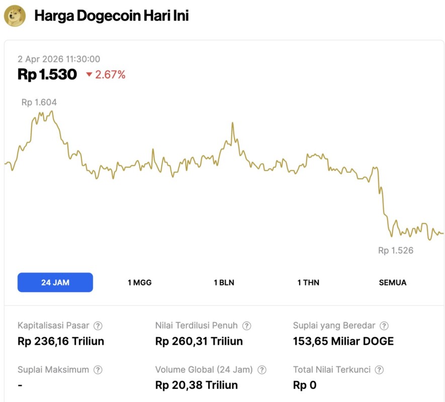 Pada 2 April 2026,Ā hargaĀ DogecoinĀ tercatat mengalami penurunan 2,67% dalam waktu 24 jam, diperdagangkan pada harga $0.08993 atau setara dengan Rp1.530. Dalam periode 24 jam terakhir,Ā harga DOGEĀ bergerak dalam kisaran Rp1.604 hingga ke Rp1.526.