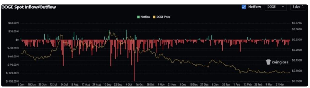 Data arus pasar juga semakin mendukung struktur pergerakan DOGE saat ini. Data bursa terbaru menunjukkan net outflow yang konsisten, mengindikasikan bahwa DOGE secara bertahap dipindahkan keluar dari bursa, bukan disiapkan untuk dijual.