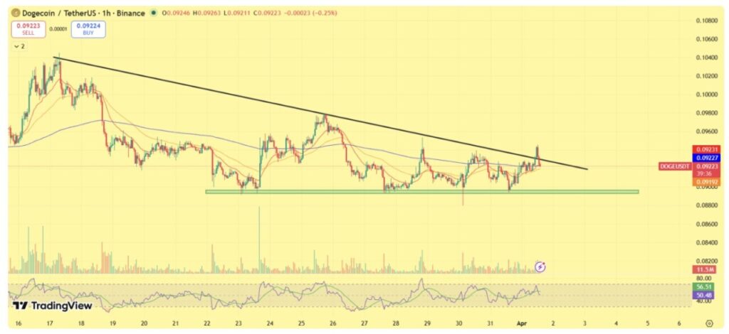 Harga Dogecoin kini mendekati titik penting yang kemungkinan akan menentukan arah selanjutnya. Jika pembeli berhasil mendorong harga meme coin ini menembus $0.10, April berpotensi menjadi awal kelanjutan kenaikan menuju zona resistance yang lebih tinggi, didukung oleh meningkatnya aktivitas jaringan dan sentimen pasar yang membaik.