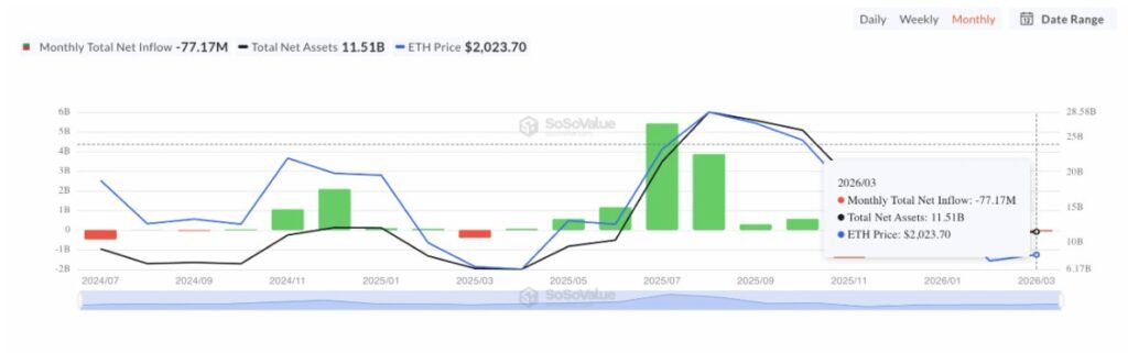 Berdasarkan data SoSoValue, ETF spot ETH di AS berpotensi menutup kuartal I 2026 di zona negatif, dengan Maret saja mencatat arus keluar bersih sebesar $77,17 juta.