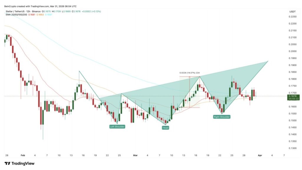 Grafik 12 jam turut mencerminkan peningkatan optimisme tersebut. Saat ini tengah terbentuk pola inverse head and shoulders, dengan bahu kanan yang sudah mulai terlihat. XLM juga sedang menguji Exponential Moving Average (EMA) 20 periode dan 50 periode, yaitu indikator tren yang memberi bobot lebih besar pada pergerakan harga terbaru. Terakhir kali XLM berhasil kembali menembus kedua EMA ini dengan kuat pada 12 Maret, harganya sempat melonjak 15%.