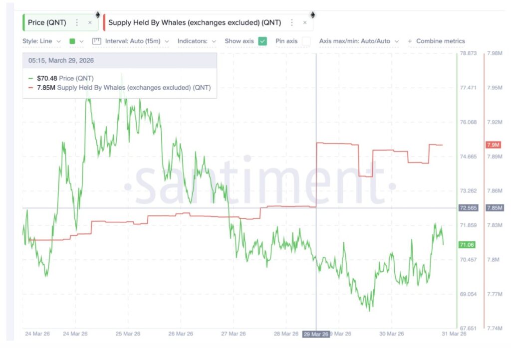 Aktivitas whale pada QNT juga sejalan dengan kekuatan harga tersebut. Pada 29 Maret, suplai QNT yang dipegang whale tercatat sebesar 7,85 juta QNT. Setelah itu, jumlahnya meningkat menjadi 7,9 juta, menandakan akumulasi yang konsisten tepat saat bulan hampir berakhir. Waktu kenaikan ini penting karena 29 Maret juga menjadi momen munculnya sinyal bullish divergence pada grafik harian.
