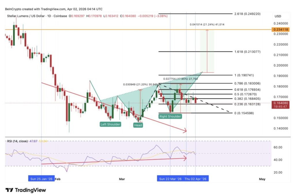 Apabila candle harga XLM pada 3 April ditutup di atas $0,163, maka lapisan divergensi bullish tambahan akan terkonfirmasi. Hambatan awal berada di area $0,176, yang merupakan level 0,618. Sebaliknya, jika harga turun menembus $0,154, maka seluruh struktur inverse head-and-shoulders akan batal.