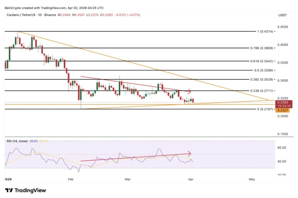Pada grafik harian, ADA terlihat membentuk pola bearish triangle dengan garis tren bawah berada di sekitar $0,2327. Dalam 30 hari terakhir, harga ADA telah turun 13%, dan pada sesi terbaru kembali melemah 4,07%, sehingga semakin mendekati area support itu di setiap pembentukan candle.
