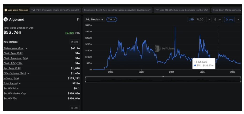 Meski begitu, fundamental on-chain Algorand justru menunjukkan pelemahan. Berdasarkan data DefiLlama, total value locked (TVL) sektor DeFi di Algorand turun dari $133,27 juta pada Juli 2025 menjadi $53,76 juta. Penurunan sekitar 60% ini kontras dengan kenaikan harga bulanan sebesar 15%, sehingga muncul ketidaksesuaian antara pergerakan harga dan tingkat penggunaan fundamental jaringan.