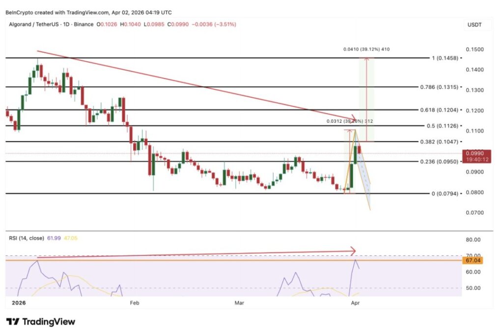Arah ALGO sepanjang April sangat bergantung pada kemampuan harga bertahan di level $0,095. Jika penutupan harian tetap berada di atas area tersebut, struktur bull flag masih dinilai valid dan membuka peluang kenaikan menuju $0,104, lalu berlanjut ke proyeksi penuh di sekitar $0,145.