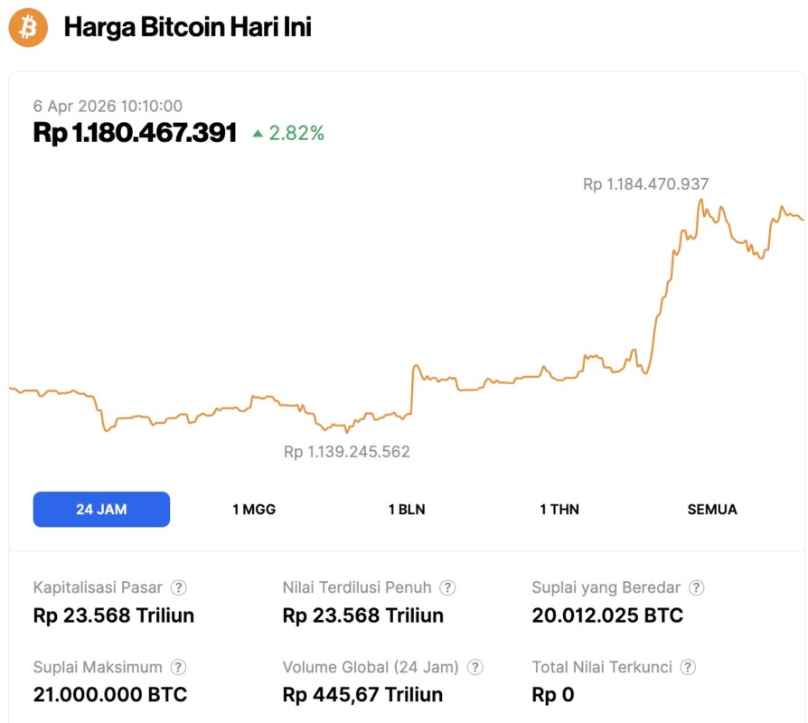 Pada 6 April 2026,Ā harga BitcoinĀ tercatat berada di level $69,103 atau setara dengan Rp1.180.467.391, mengalami kenaikan 2,82% dalam 24 jam terakhir. Sepanjang periode ini, BTC menyentuh level terendahnya di Rp1.139.245.562 dan harga tertingginya di Rp1.184.470.937.