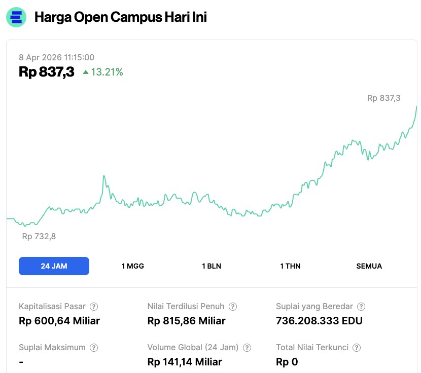 Harga Open Campus (EDU) per 8 April 2026 tercatat berada di level Rp837,3. Dalam 24 jam terakhir, aset ini mencatat kenaikan sebesar 13,21%, yang menunjukkan penguatan harga yang cukup konsisten sepanjang perdagangan harian.
