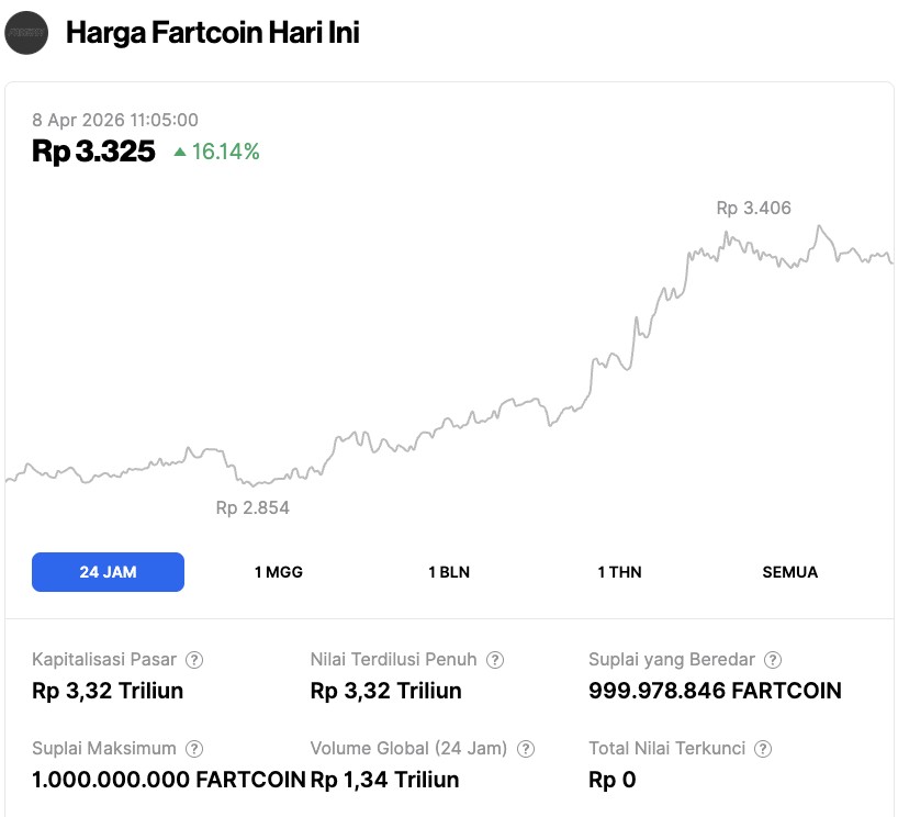Pada 8 April, harga Fartcoin tercatat berada di level Rp3.325. Dalam 24 jam terakhir, aset ini membukukan kenaikan sebesar 16,14%, yang menunjukkan penguatan harga yang tetap solid sepanjang periode perdagangan harian.