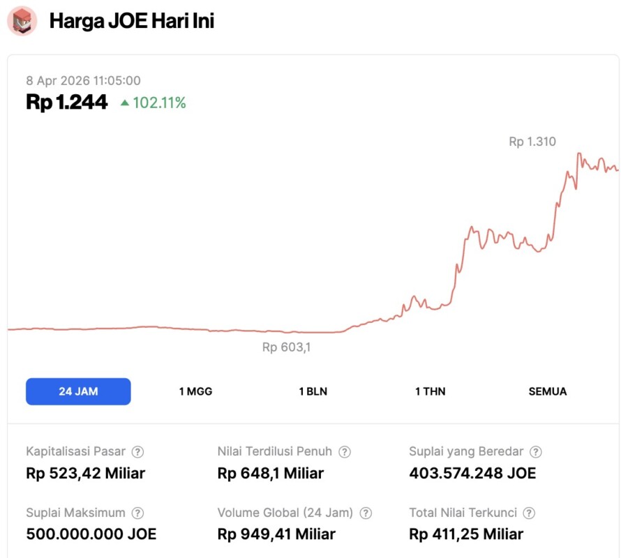 Berdasarkan data Pintu Market, harga JOE per 8 April tercatat berada di level Rp1.244. Dalam periode 24 jam terakhir, JOE membukukan kenaikan yang sangat signifikan, yakni sebesar 102,11%, yang menunjukkan adanya lonjakan minat pasar dalam waktu singkat.
