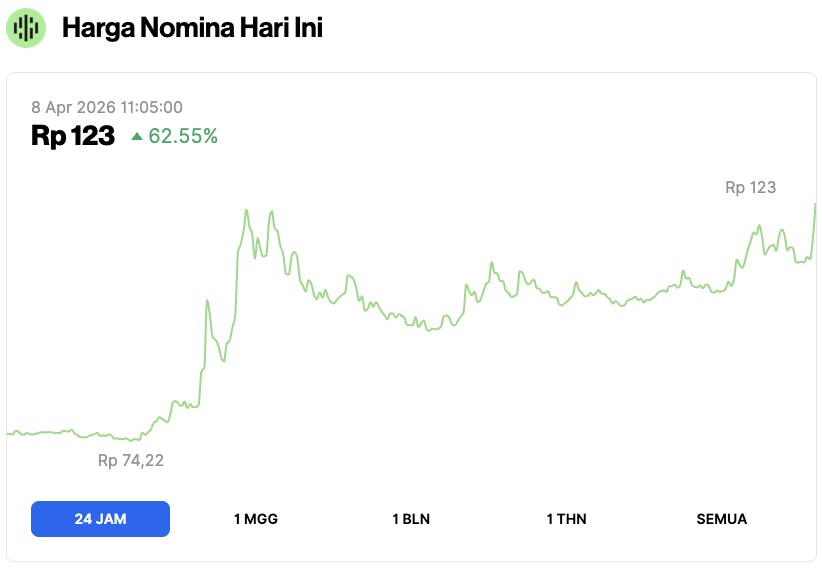 Berdasarkan Pintu Market, harga Nomina per 8 April 2026 tercatat berada di level Rp123. Dalam 24 jam terakhir, aset ini mengalami kenaikan sebesar 62,55%, yang menunjukkan penguatan harga yang cukup tajam dalam perdagangan harian.