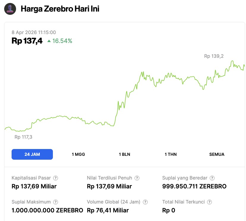 Dari sisi valuasi, kapitalisasi pasar Zerebro saat ini berada di kisaran Rp137,69 miliar. Sementara itu, volume perdagangan global dalam 24 jam terakhir tercatat sebesar Rp76,41 miliar.