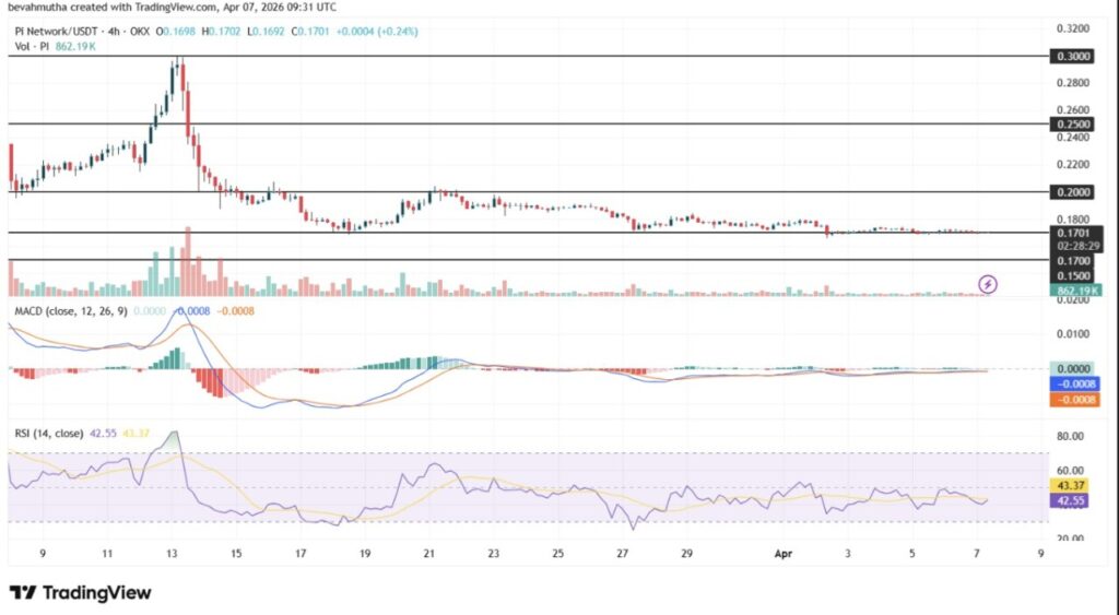 Per 7 April, harga koin Pi berada di level $0.1696. Indikator MACD menunjukkan nilai negatif, yang merupakan sinyal bearish dan mengindikasikan bahwa sentimen pasar masih belum cukup kuat.