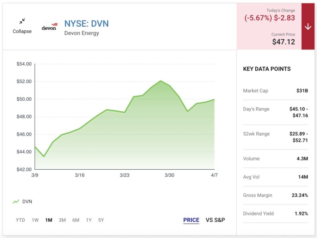 Devon Energy (DVN) adalah perusahaan eksplorasi dan produksi (E&P) yang berfokus pada pasar Amerika Serikat. Perusahaan ini memiliki operasi yang terdiversifikasi di sejumlah cekungan minyak berbiaya rendah dan kaya sumber daya. Diversifikasi tersebut memungkinkan Devon memproduksi minyak dan gas alam dalam volume besar dengan biaya yang efisien, sehingga menghasilkan arus kas yang kuat.
