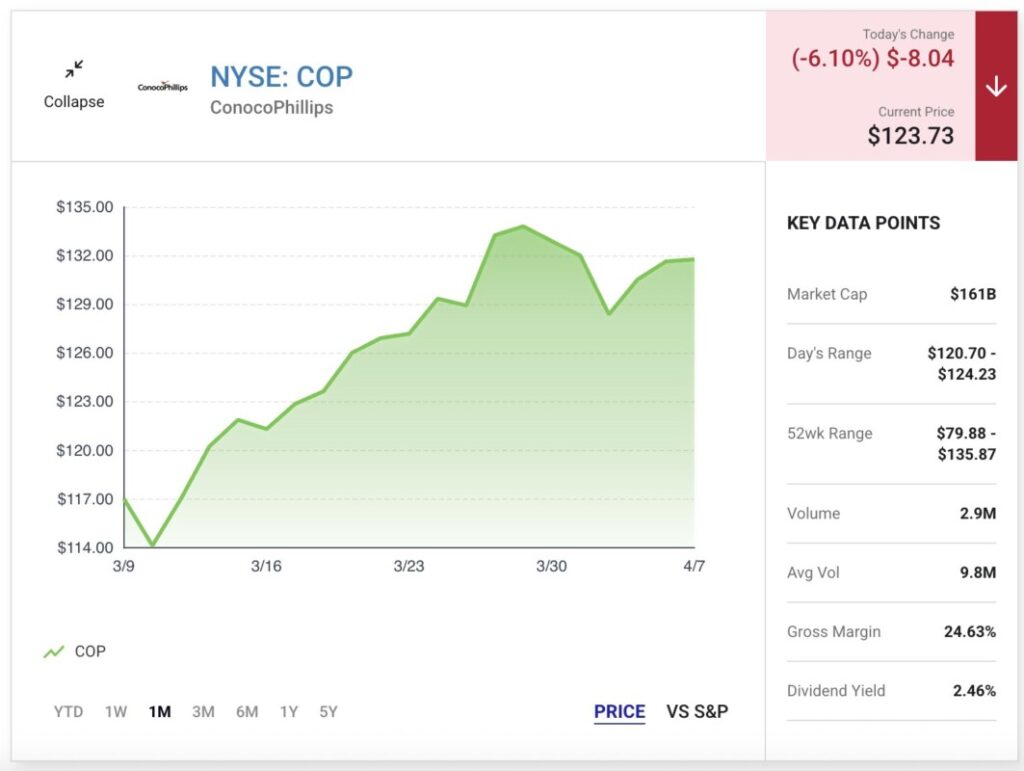 ConocoPhillips (COP) merupakan salah satu perusahaan eksplorasi dan produksi (E&P) minyak dan gas terbesar di dunia. Perusahaan ini berfokus pada pencarian serta produksi minyak dan gas alam, dengan operasi yang tersebar di lebih dari selusin negara.