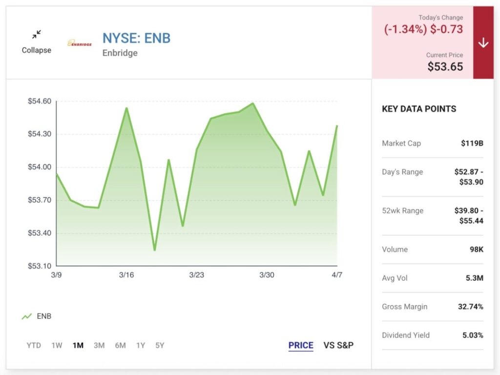 Enbridge (ENB) mengoperasikan salah satu sistem jaringan pipa minyak terbesar di dunia. Perusahaan ini menyalurkan sekitar 30% produksi minyak di Amerika Utara. Selain itu, Enbridge juga memiliki jaringan pipa gas alam yang luas, bisnis utilitas gas alam, serta operasi di sektor energi terbarukan.