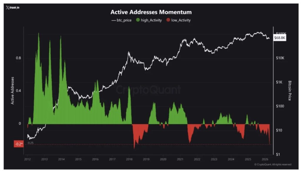 Data CryptoQuant menunjukkan bahwa Active Address Momentum Bitcoin turun ke -0,2, yang menandakan melemahnya partisipasi pasar. Angka ini bahkan menjadi yang paling ekstrem sejak 2018.