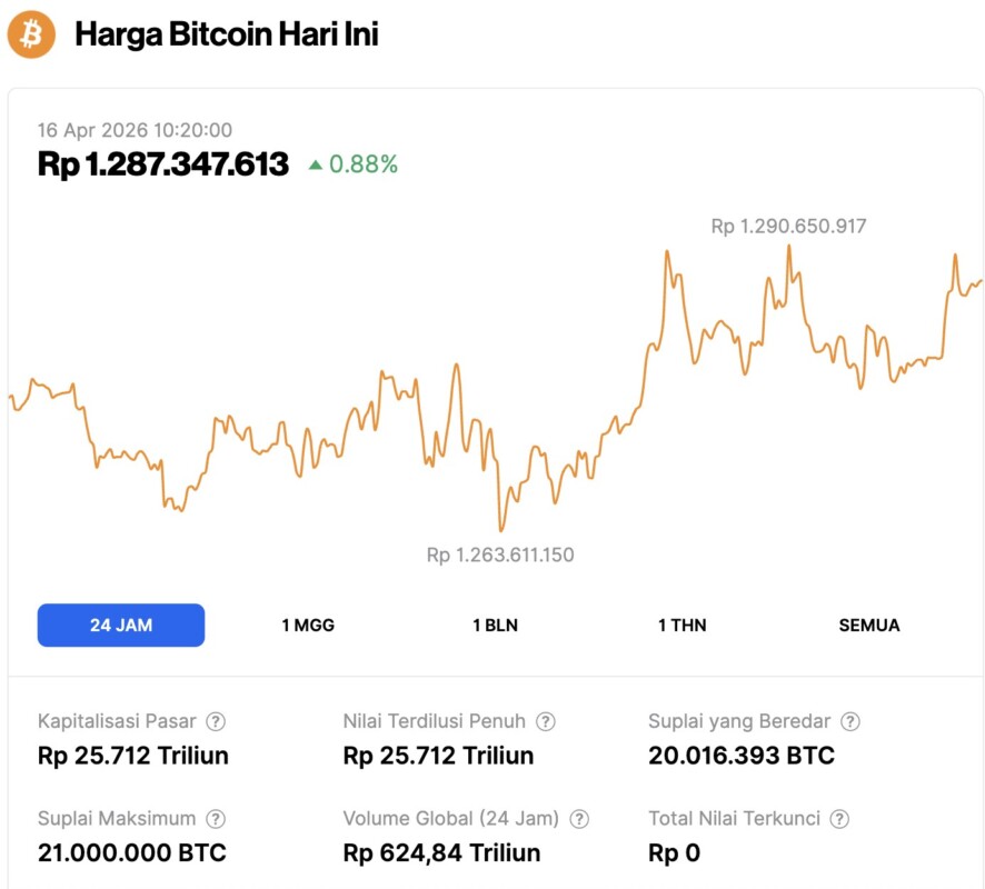 Pada 16 April 2026, harga Bitcoin tercatat berada di level $75,033 atau setara dengan Rp1.287.347.613, mengalami kenaikan 0,88% dalam 24 jam terakhir. Sepanjang periode ini, BTC menyentuh level terendahnya di Rp1.263.611.150 dan harga tertingginya di Rp1.290.650.917.