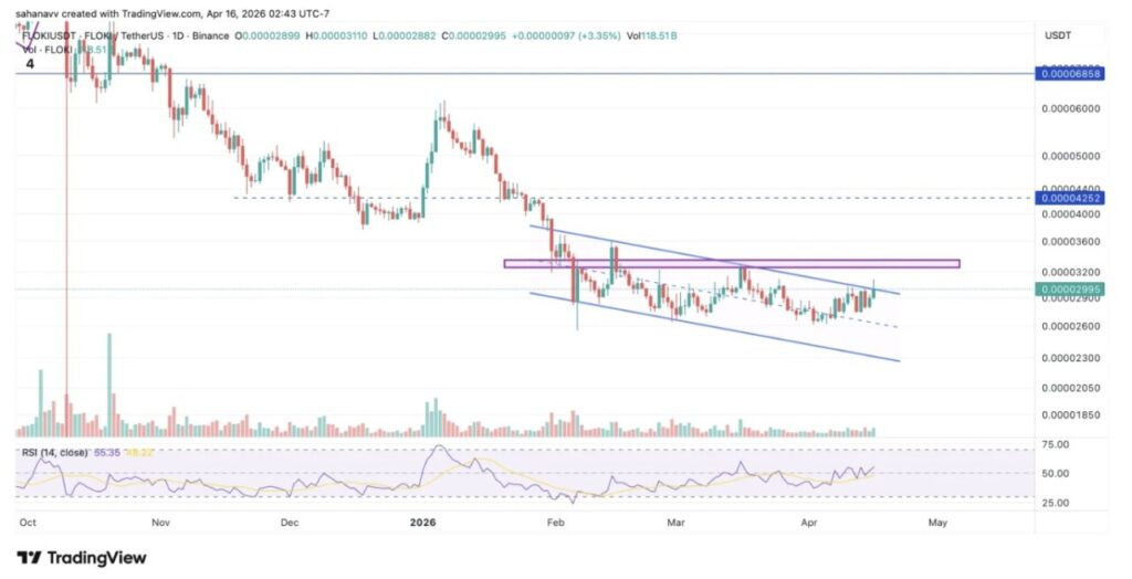 Harga FLOKI masih berada dalam saluran menurun (descending channel) yang jelas, dengan titik tertinggi yang lebih rendah (lower highs) dan titik terendah yang lebih rendah (lower lows) yang mempertegas struktur bearish yang lebih luas.