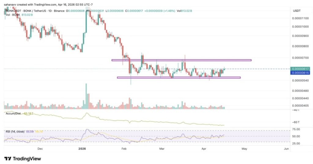 Bonk sedang mengalami konsolidasi dalam rentang horizontal yang terdefinisi dengan baik, bertahan di antara support $0,0000055 dan resistance $0,0000068, yang mengindikasikan adanya akumulasi setelah tren turun. Harga saat ini sedang menekan ke arah batas atas rentang (~$0,0000065–$0,0000068), yang mengisyaratkan potensi upaya breakout seiring dengan mengompresnya volatilitas.