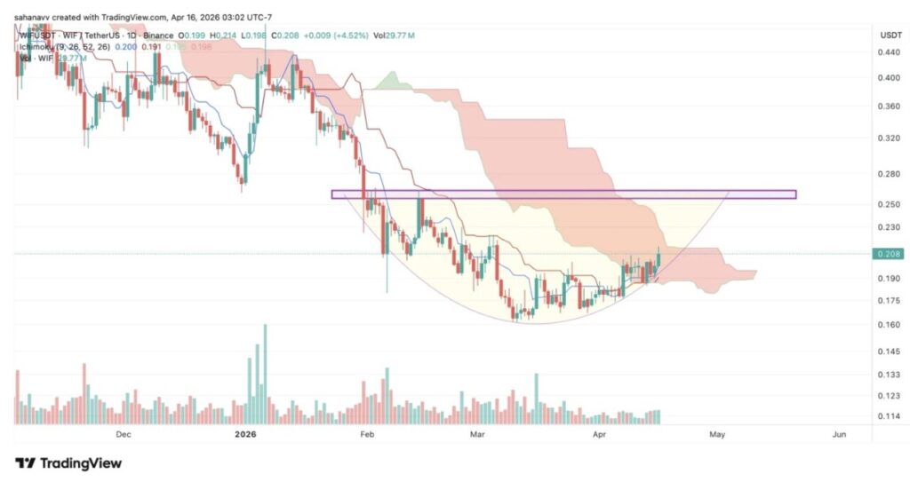 Breakout ke atas $0,26 dapat mendorong harga menuju $0,30 dan $0,34, sementara penolakan (rejection) dapat menarik WIF turun kembali menuju support $0,18–$0,16, sehingga menjaga struktur bearish tetap utuh.